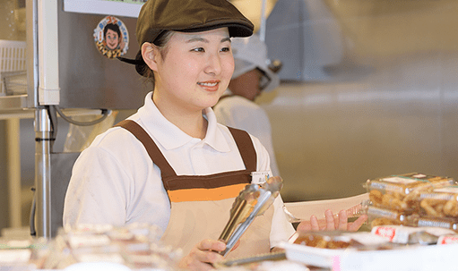 惣菜店では、販売員も揚げ物など調理を行います。調理未経験の方も先輩がついて指導。約1か月で一通りできるようになるのでご安心を。