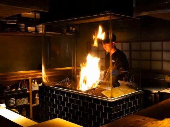 客席と地続きの焼き場は、まさにあなたの「ステージ」。800度を超える豪快な炎を操り、皮目はパリッと、身はレアに、鰹が持つ旨味を最大限に引き出す瞬間は、調理担当にしか味わえない緊張感と高揚感に満ちています。