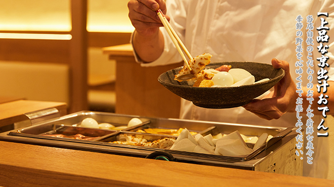 京野菜を使った天ぷらや、おでんを中心とした本格和食が楽しめる居酒屋です。料理に合わせて厳選した日本酒・地酒も豊富に取り揃え、四季折々の味覚を気軽に堪能できるのが魅力。