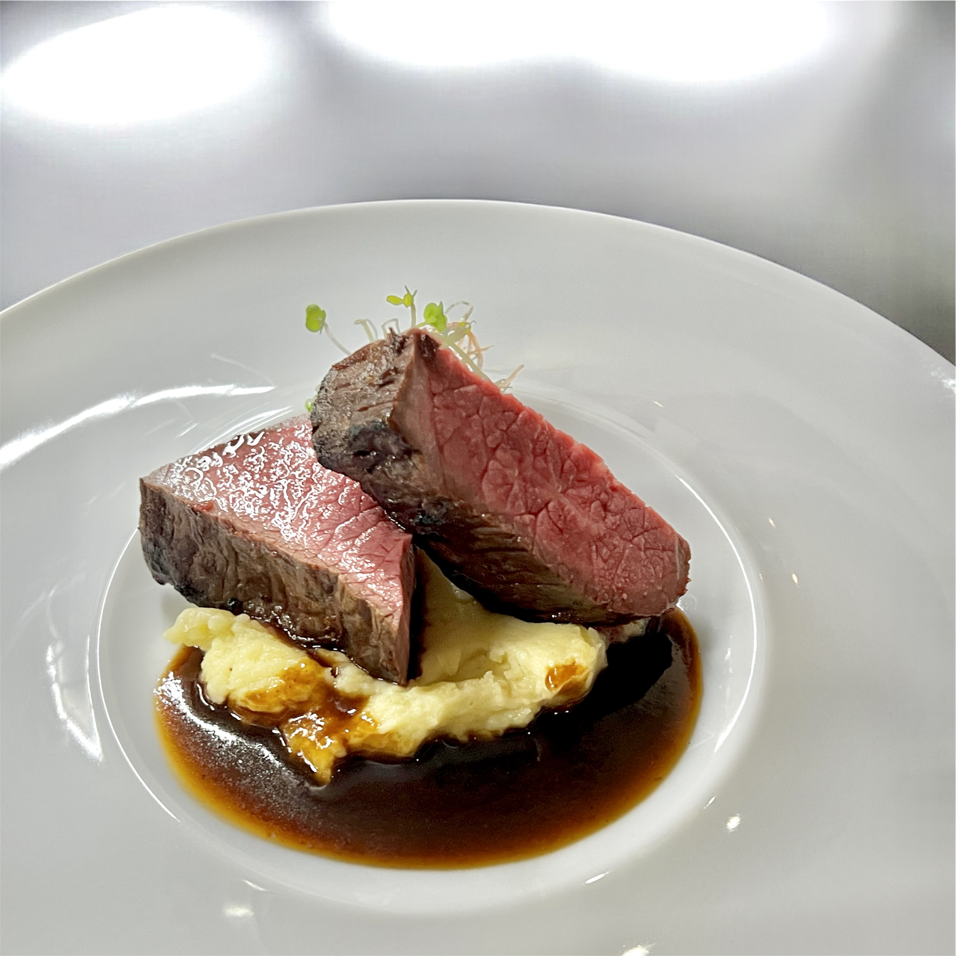 お店は建物の2階にあり、1階は当社が60年以上運営している認定近江牛精肉店。その精肉店直営として、近江牛や和牛を使ったステーキやすき焼き、また旬の食材を用いた逸品料理など、お肉メニューを中心とした幅広い料理を提供しています。