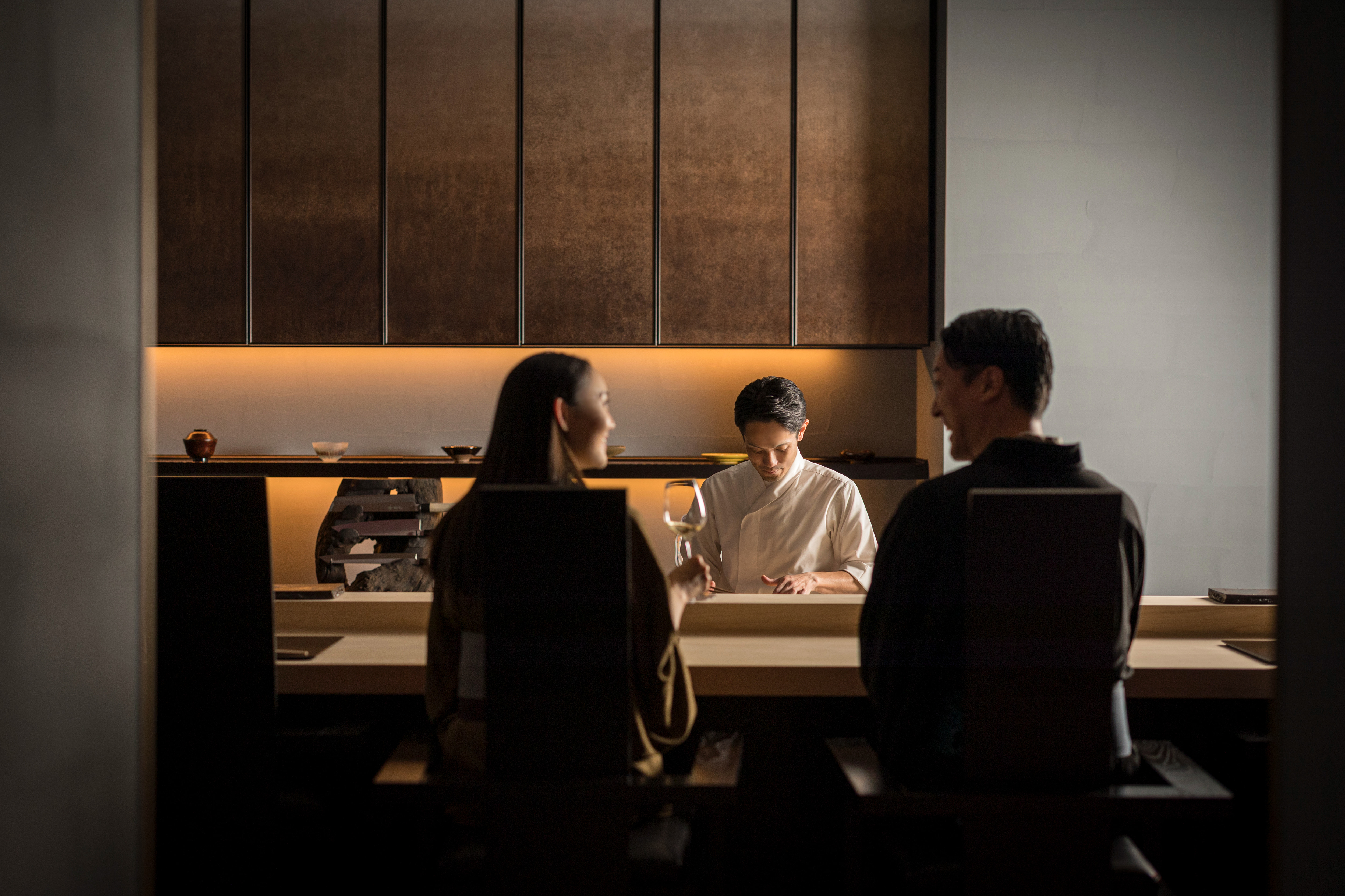 星のや東京館内、カウンター8席のみの鮨店。落ち着いた空間で料理に集中できます
