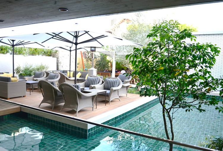 緑と水に囲まれたテラス席。都心とは思えない癒しの空気が広がります。