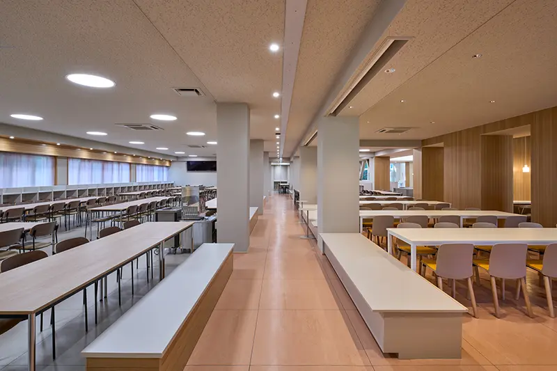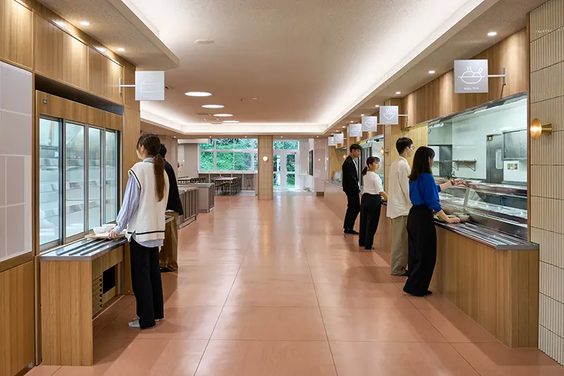 明るく広々とした学内食堂。学生の「いただきます」を支える現場です。