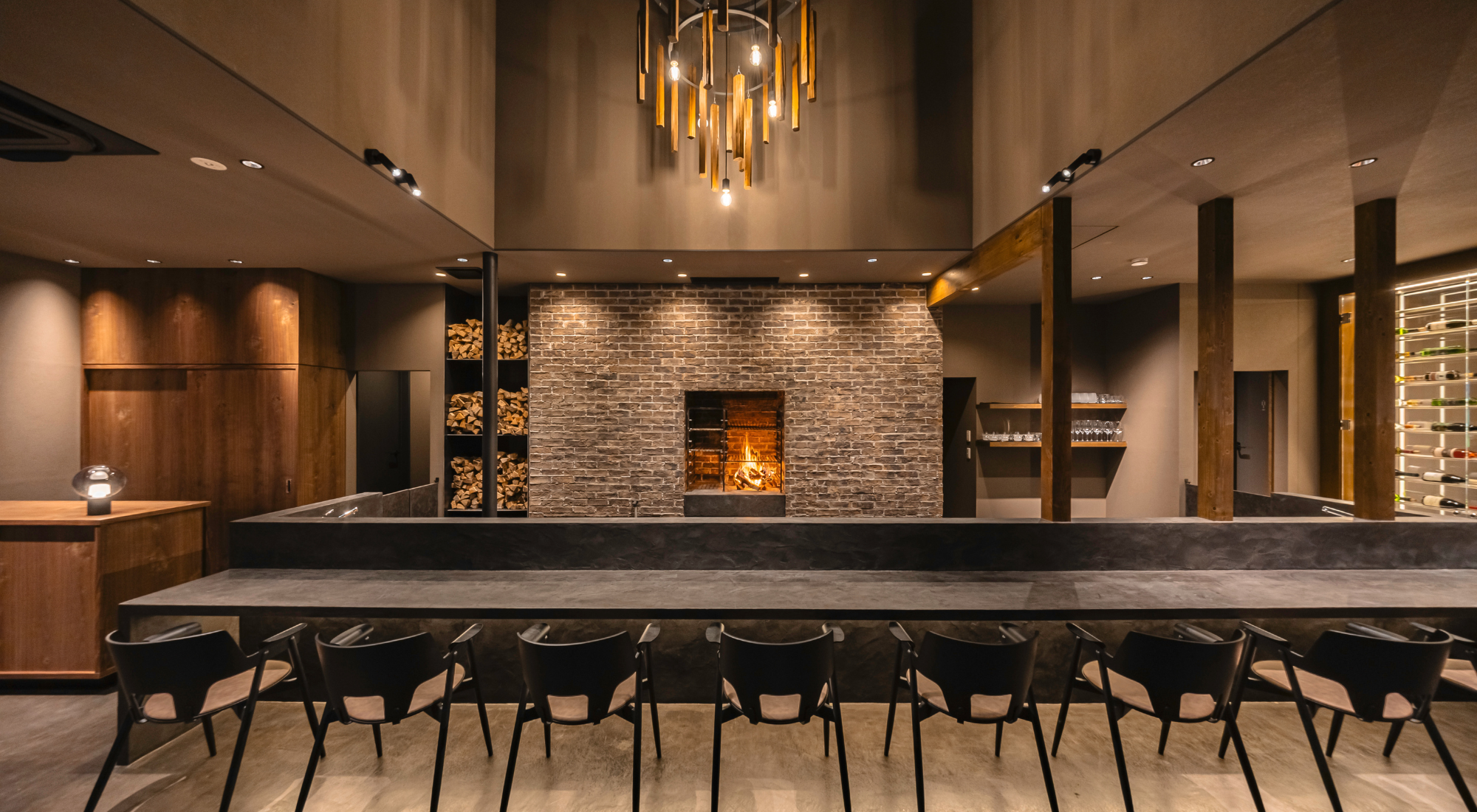 薪の炎が揺らめくオープンキッチン。静けさとぬくもりが同居する上質な空間です。
