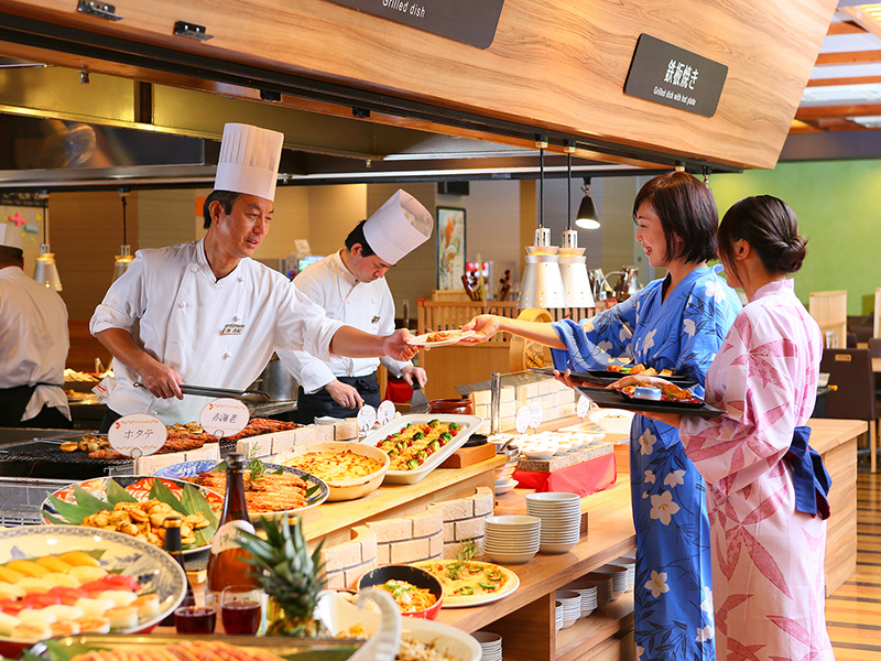 香りや音まで楽しめる“ライブキッチン”。おもてなしが伝わるバイキングの風景