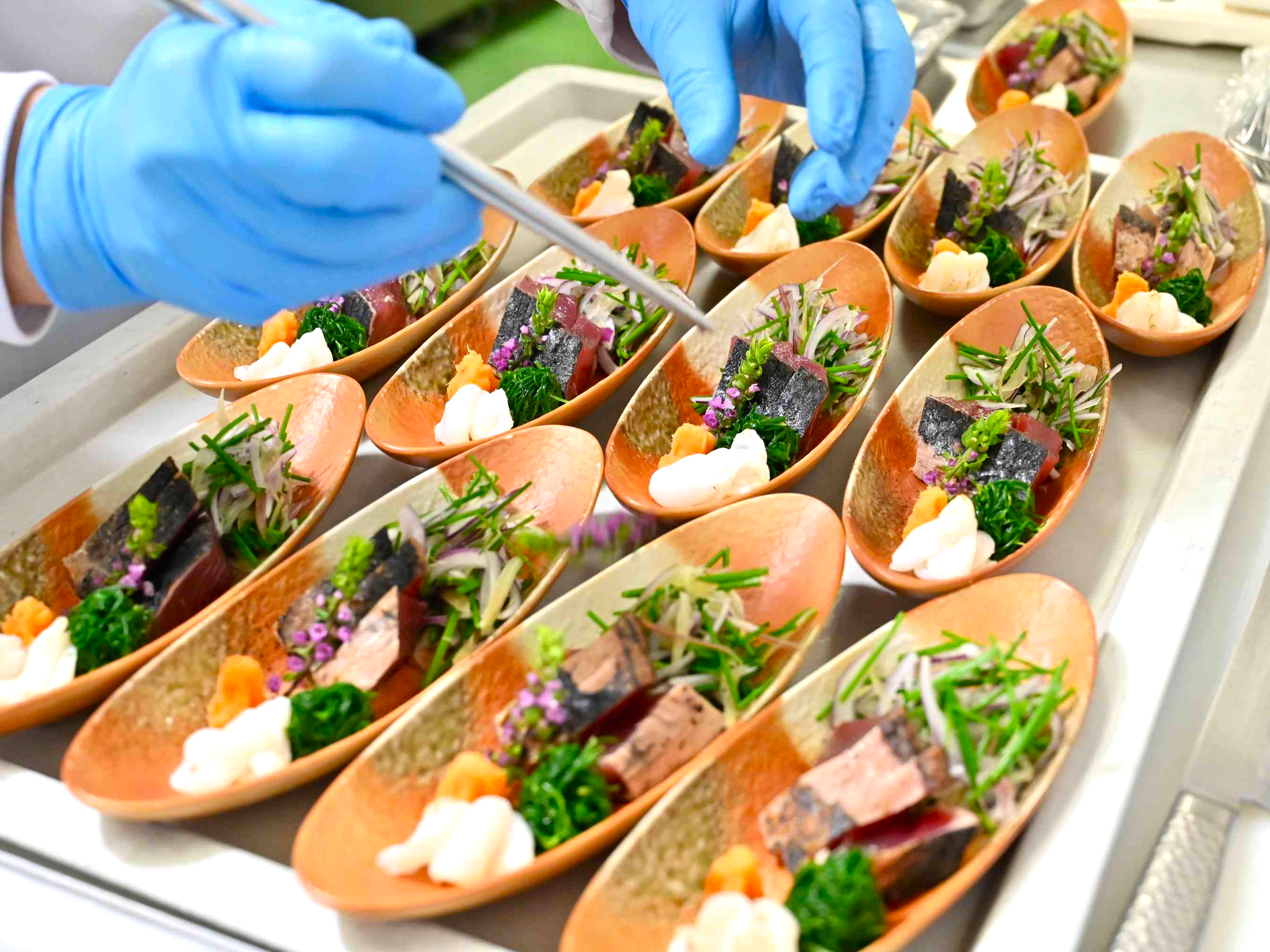 機内食のメニュー開発から製造まで、調理業務全般をお任せします。板場、煮方、八寸など、これまでのご経験やスキルに応じた部門へ配属します。1日約13,000食という大規模な製造数でありながら、基本的には機械に頼らず、職人の手仕事による調理を大切にしているのが特徴です。