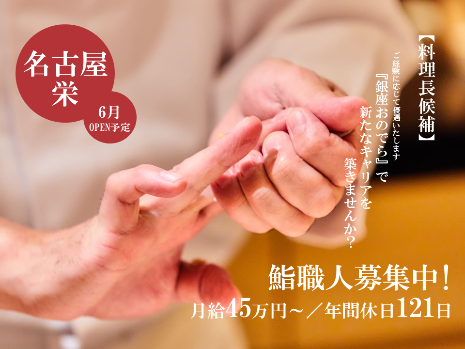 中でも『鮨 銀座おのでら』は、2013年のオープン以来予約困難店として人気を博してきました。今回は、今後もより多くのお客様に楽しい時間を提供するために、そして今後も店舗拡大を続けるため、『廻転鮨 銀座おのでら』新店にて寿司職人を募集します。
