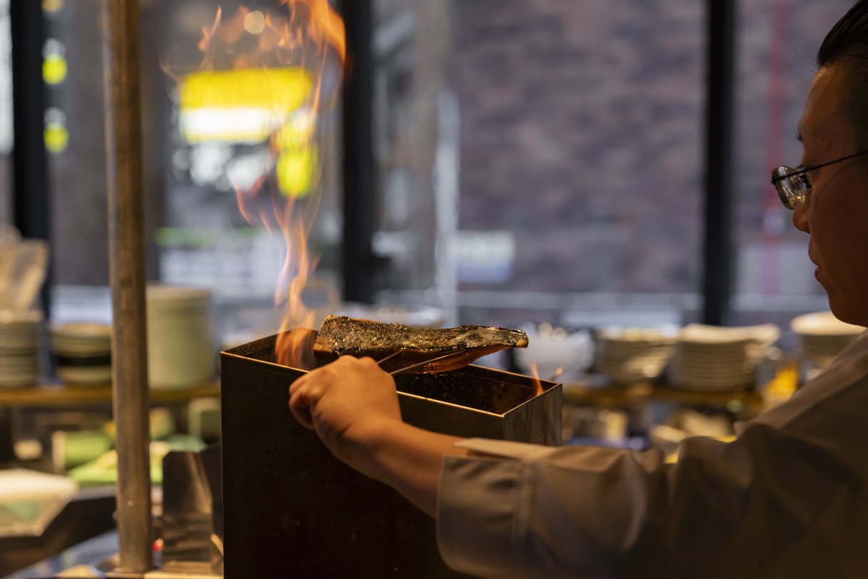 看板メニューの原始焼きをはじめ、素材の魅力を引き出す火入れや仕上げ、ライブ感のあるカウンター越しに届ける一皿づくりにも携わります。