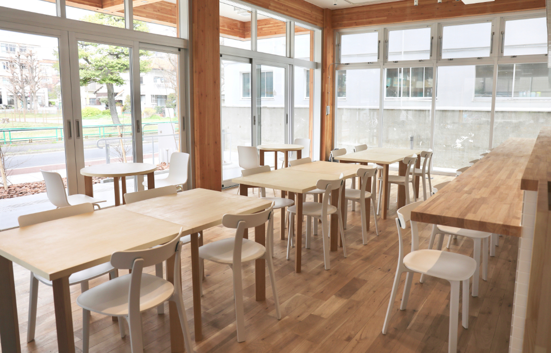 木のぬくもりに包まれた、明るく落ち着いた空間。 地域の方が自然と立ち寄れるカフェを目指しています。